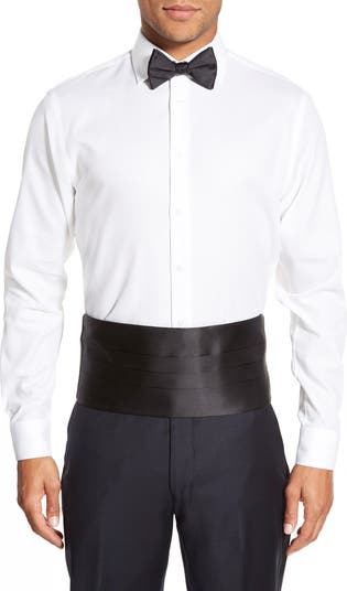 A classic bow tie and pleated cummerbund are fashioned from fine silk.