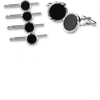 Diamond-cut sterling silver surrounds an onyx disc in two cuff links and four matching studs.