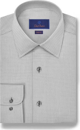 A neat geometric pattern smartens the look of this striking dress shirt made from cool and comfortable cotton with adjustable button cuffs.