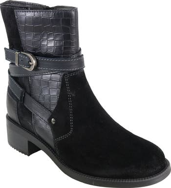 Mixed textures and aged-finish hardware bring striking dimension to a leather bootie featuring optimal underfoot cushioning and a grippy rubber sole.