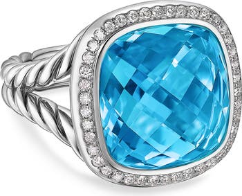 A halo of diamonds frames a bright blue topaz on this split-shank ring done in the label's signature cable texture.