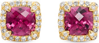 Icy, pavé-set diamonds frame colorful faceted stones in these petite stud earrings that will send light bouncing with every twist.