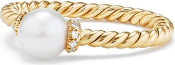 18-karat yellow gold. White cultured freshwater pearl, 6mm. Pavé diamonds, 0.08 total carat weight. Ring, 2.4mm. Made in Italy.