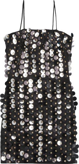 Sequin discs in silver and black. Center back invisible zipper. Dance-ready fit. Statement shimmer.