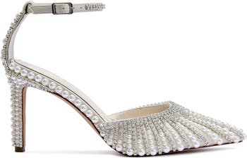 Pumps fit for a princess. Ivory point-toe pump with a pearl-adorned ankle strap in a vertical setting—elegant, luxe, and refined. Heel height: 2.5"