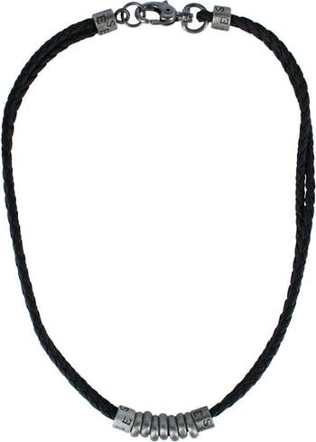 Command attention with quiet confidence. The DaVinci Vegan Metal Bead and Ring Necklace is a bold statement in refined masculinity, meticulously crafted for the modern man who values both design and conscience. At its core is a double-stranded, tightly braided vegan leather cord, a not to sustainability without compromising strength or style. The rich, jet-black hue created a striking contrast with the industrial-chic antiqued silver-toned metal beads, each hand-finished to achieve a rugged elegance. These center rings add visual weight and texture while anchoring the necklace in both form and function. Each end of the necklace is completed with rounded metal clasps engraved with subtle detailing, culminating in a robust lobster clasp for secure and seamless wear. It is a piece that can stand alone or layer effortlessly with other chains for a curated, look. Measures 20 inches in length.