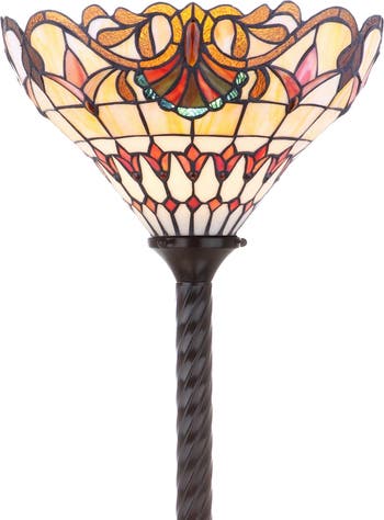 One of the finest techniques to come out of the Art Nouveau movement, the Tiffany-style stained glass shade on this torchiere floor lamp makes for a stunning addition to any space. While steeped in traditional design with it's barley-twist base and romantic baroque motif on the shade, this piece is updated with the functionality expected today -- a step-on on/off button, LED bulb compatibility, and a beautiful silk-wrapped cord. Each shade is hand-made by artisans who specialize in the intricate art of stained glass soldering.