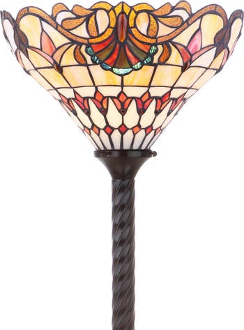 One of the finest techniques to come out of the Art Nouveau movement, the Tiffany-style stained glass shade on this torchiere floor lamp makes for a stunning addition to any space. While steeped in traditional design with it's barley-twist base and romantic baroque motif on the shade, this piece is updated with the functionality expected today -- a step-on on/off button, LED bulb compatibility, and a beautiful silk-wrapped cord. Each shade is hand-made by artisans who specialize in the intricate art of stained glass soldering.