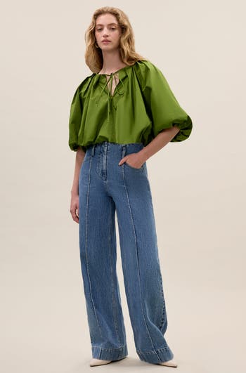 These wide-leg denim pants in a medium Dax wash combine classic appeal with contemporary details. Accentuated by refined topstitching and pintuck accents, they offer a modern fit that's as stylish as it is comfortable.