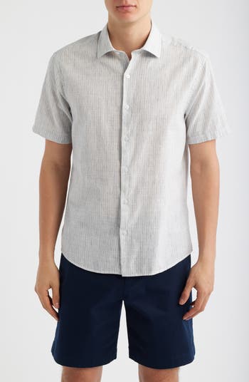 A muted print adds subtle style points to a cotton-forward sport shirt that's ready for summery days and warm nights.