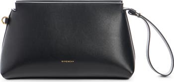 A goldfoil Givenchy logo stamps the supple Italian leather of a plump pouch that can be carried by a slender wrist strap.