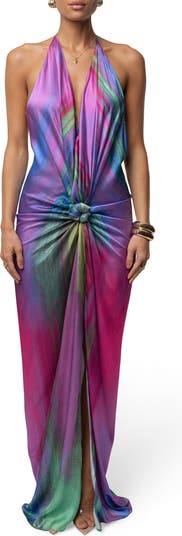 Vibrant hues paint the body in this daring dress designed with a plunged neckline and an alluring open back.