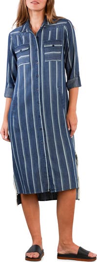 Crisp stripes delineate a button-front, midi-length shirtdress cut from a breathable cotton-lyocell blend and finished with soft fraying at the vented high-low hem.