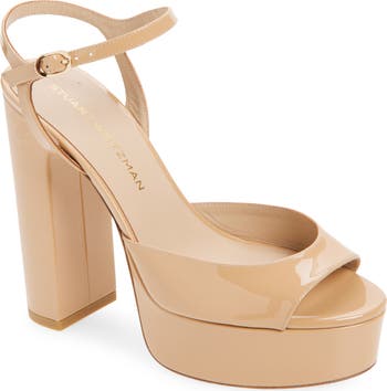 A superchunky platform and soaring block heel add scene-stealing height to a patent sandal secured with a slender ankle strap.
