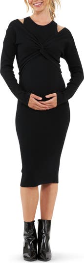 Perfect your evening look with the Dayna Nursing Knit Dress. Meticulously curated from a viscose blend, our latest little black dress features sculpted detailing at the front, with a round neckline and semi-off the shoulder design, with fitted long sleeves. The cross-over design at the waist is not only flattering, but provides discreet nursing access. Perfect for any occasion, this modern silhouette will pair perfectly with knee high boots. Semi fitted top attached at side seams to slim fit dress Fully fashion knit V neckline top, over a round neck dress Long sleeve Nursing access Nursing 72% Viscose, 28% Nylon Length: 114cm (size small)