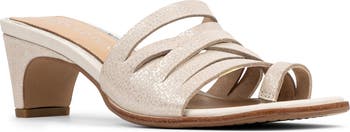 Interwoven straps heighten the modern sophistication of a block-heel sandal grounded by memory foam cushioning.