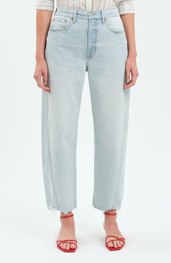 A laid-back mix of relaxed and tapered, these jeans are made with faded low-stretch denim and fraying hems that can be cuffed for another look.