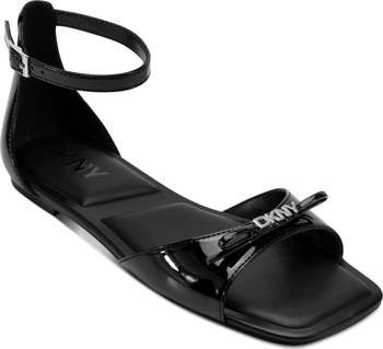 A logo-embellished bow and slim ankle strap add dainty finishing touches to a glossy patent sandal set on a lightly cushioned footbed.