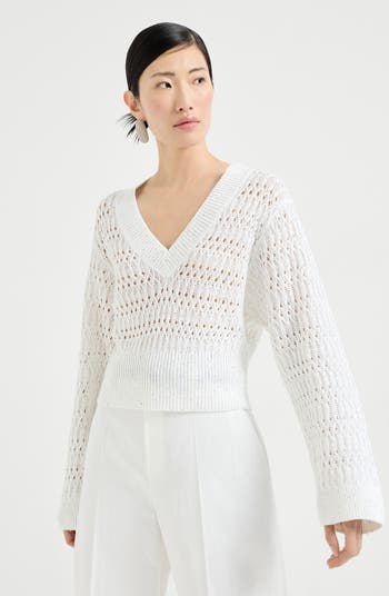 The crafting of the lightweight yarn combines the natural linen fiber with small sequins embedded into the yarn, spreading delicate reflections throughout the garment’s surface.