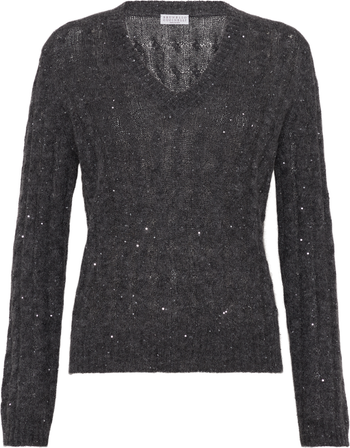 The mohair yarn provides a lightweight, cozy texture with a slightly airy look. The presence of cotton, wool and a synthetic fiber helps to maintain the garment’s structure and ensure comfort. The addition of a yarn of sequins enriches the refined natural fibers with intense sparkling reflections.