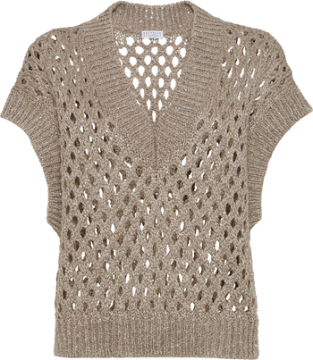 The fine linen and silk yarn stands out for its slightly irregular hand, which lends the texture a refined, authentic feel. The entire surface is delicately illuminated by small sequins, adding a touch of sophisticated and feminine sparkle.