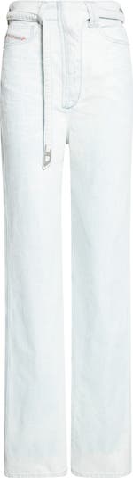 A D-tipped deconstructed biker-style integrated belt wraps the high waist (or not) of these slim-fit jeans in a barely blue wash.