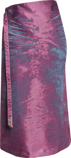 A D-tipped deconstructed biker-style integrated belt morphs into (or out of) the waist on this spring '26 runway-featured skirt cut in a pencil silhouette from the brand's innovative satin denim in shimmering purple hue.