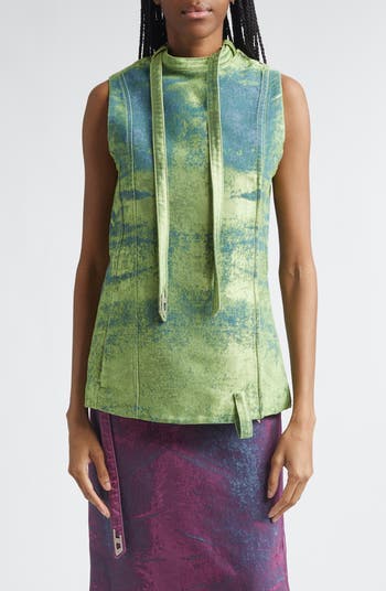 A D-tipped deconstructed biker-style integrated belt morphs into (or out of) the band collar on this spring '26 runway-featured vest cut in a longline silhouette from the brand's innovative satin denim in mottled, shimmering green-blue hue.
