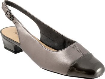 A squared-off cap toe and low block heel balance a slingback leather pump furnished with a cushioned footbed for comfortable wear.