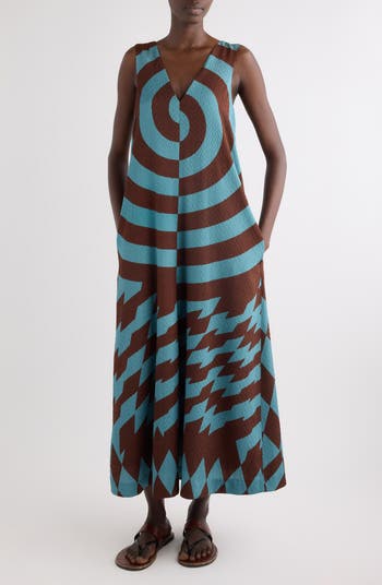 A mix of graphic prints writ large across the raised-chevron-patterned fabrication speaks to the Belgian brand's affinity for all things bold (and sometimes bemusing) on this stretch-silk trapeze dress from Van Noten successor Julian Klausner's spring '26 collection.