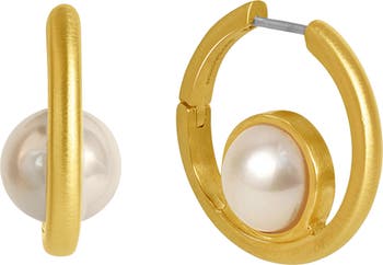 Cultured pearls seem to float in these brushed hoop earrings plated in 22-karat gold.