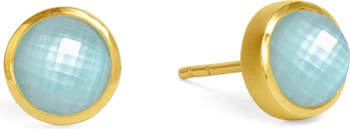 Faceted mother-of-pearl doublets bring extra luster to dainty bezel stud earrings plated in polished 22-karat gold.