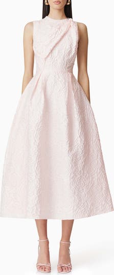 Tonal blooms and a whispered hue make a softly striking impact for a full-skirted party dress cut to a beloved and versatile midi length.
