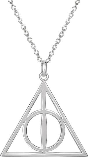 • Stylishly enter the Harry Potter universe wearing a Deathly Hallows pendant necklace. Triangular pendant features the Deathly Hallows symbol