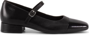 A slender strap adjusts for a secure fit on a luxe leather mary jane fashioned with a squared-off cap toe for trendsetting appeal.