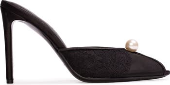 Pointy toe micro peep toe mule with pearl ornament, set on a straight stiletto heel.