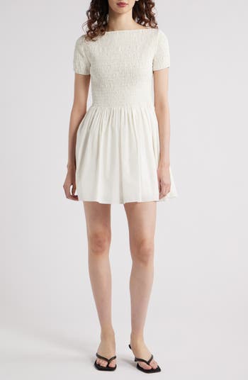A smocked bodice offers comfort and flexibility in this lightweight cotton minidress that highlights your collarbones with a bateau neckline that also balances the silhouette.