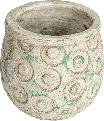 - A rustic yet elegant piece, this terra-cotta planter features debossed circles and a distressed green finish for a touch of pastoral charm