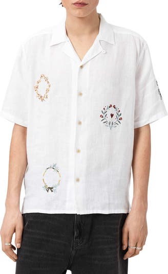Intricate embroidery underscores the breezy, relaxed feel of a camp shirt cut from lightweight linen in a fit that's roomy and gives you plenty of room to kick back.