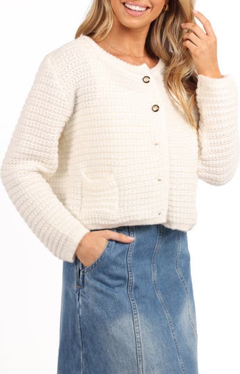 Textured stitching brings warmth to this woolly cropped cardi elevated with etched bezel buttons.