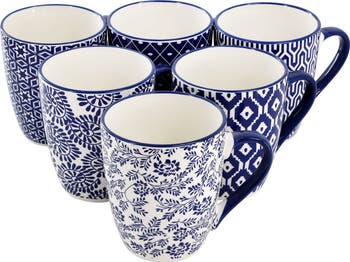 Elama Declan 6 Piece 12 Ounce Assorted Design Stoneware Mug Set, Main, color, Blue