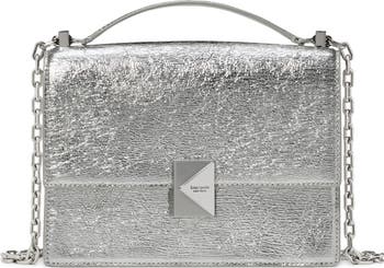 Art Deco-inspired hardware makes a signature statement on a metallic leather bag fitted with a convertible crossbody strap for versatile wear.