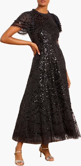 The Deco Dot Ankle Gown has an artwork inspired by 1930’s art deco styling. Developed with layered tulle sleeves and a sequin border edge for 1930’s romantic styling. The perfect gown for an upcoming special occasion.