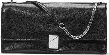 Iconic logo hardware highlights the glazed leather exterior of an East/West bag suspended from a lustrous chain strap that converts from shoulder to crossbody wear.