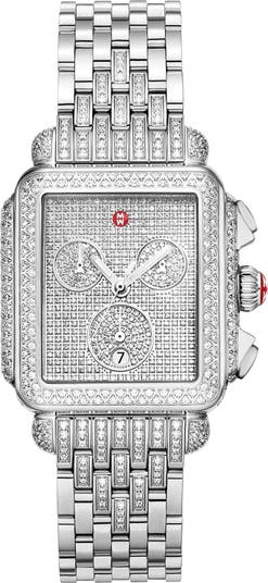 Michele's signature red-backed monogram on the dial and cabochon crown perfectly punctuate this limited-edition Deco Jubilee chronograph watch inlaid with diamonds that cover the dial and subdials, the rounded-rectangular bezel and select links of the stainless steel bracelet to put a final deco flourish on the style.