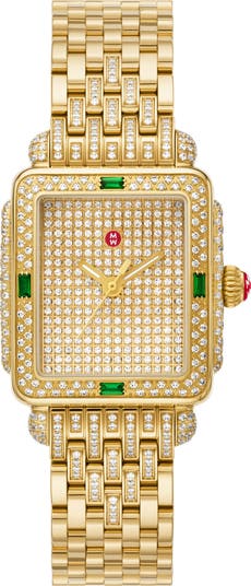 Michele's signature red-backed monogram on the dial and cabochon crown perfectly punctuate this 18-karat-gold-plated special edition of the Deco Mid watch. Pavé diamonds cover the dial, case and the lug ends of the bracelet, while green tsavorite baguettes center each side of the rectangular bezel.