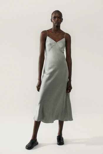 Silk Laundry bias cut dress crafted in 100% silk detailed with a subtle coiled strap, soft triangle panels and a deep v-neckline. Cut on the bias to a regular fit and ankle-length hemline.