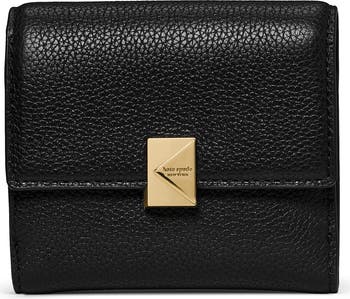 Sculptural logo hardware highlights the pebbled exterior of a leather wallet fitted with multiple card slots and a zipped compartment.