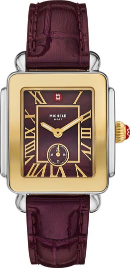 A glossy croc-embossed leather strap and high-polish Roman-numeral markers emphasize the classic elegance of this premium quartz timepiece complete with a rich, dark-cherry mother-of-pearl dial and signature Michele crown.
