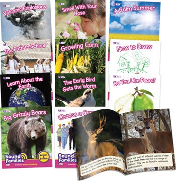 This set of non-fiction Sound Families decodable readers covers r-controlled vowel sounds (/ar/ /or/ /ur/ /air/ /ear/). There are two titles for each sound. Within each reader, alternative spellings are provided (graphemes) for the target sound (phoneme). Children can identify the target sound in the text quickly as they have been highlighted and then compare the spelling across the sound family. Other words included are decodable at the phase level as well as common exception words in accordance to the progression. The set includes 12 non-fiction readers with clear photographic images. For ages 5+, Grade 1, Book Band: Gold (Fluency 4), Guided Reading Level: K, Reading Level: 19 - 21.